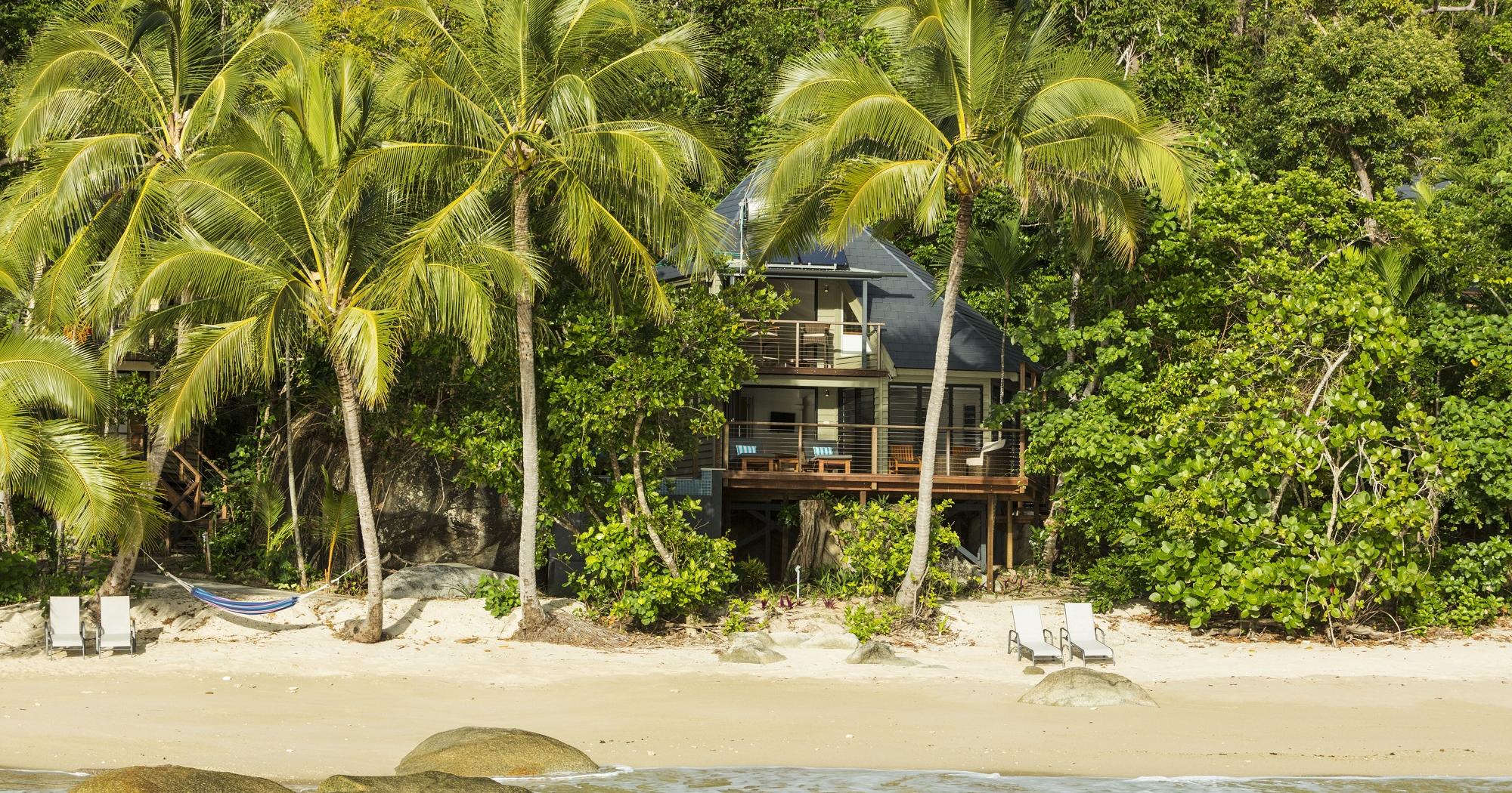 The Beach House (Villa 5) is situated right on the beach, nestled amongst the fringing coconut palms and rainforest. Featuring a wet-edge plunge pool and oversize deck, the villa offers spectacular beachfront views over the sand and ocean. The villa is a two-storey design, featuring the custom lounge and bar on the upper level and the bedroom and bathroom on the lower level. The lower level opens out onto the expansive deck creating an inviting indoor/outdoor living experience. The deck is surrounded by rainforest-clad granite boulders and enjoys a daybed, sun lounges and outdoor seating. The bathroom spills out onto the rainforest deck to the outdoor shower hidden amongst the rainforest. The villa features a work desk, LED televisions, pod espresso machine, mini bar, tablet and ipod.