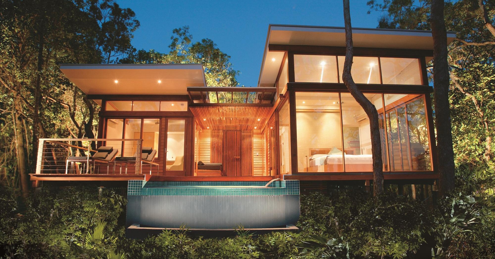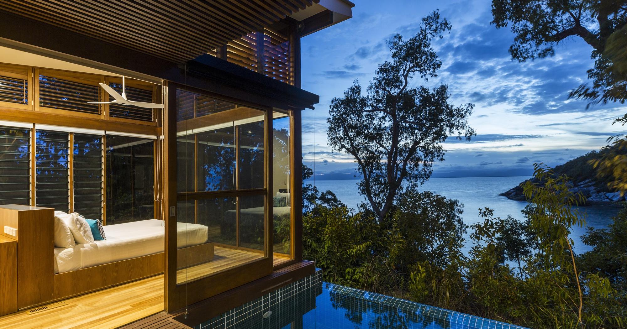 The Pavilions (Villas 15 & 16) are set in exclusive, private locations with stunning views over Wedgerock Bay. An open-plan layout is designed to take advantage of the spectacular views and create an inviting indoor/outdoor ambience. The sleeping pavilion features a custom-designed floating bed, air conditioning and a separate oversized bathroom with shower and deep bath. The living pavilion and bar offer contemporary built-in lounges, LED TV, Ipod and espresso machine. A work desk and tablet are located in the villa. The large outdoor area and deck incorporate a private plunge pool, a daybed and an alfresco dining setting.